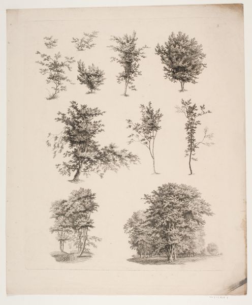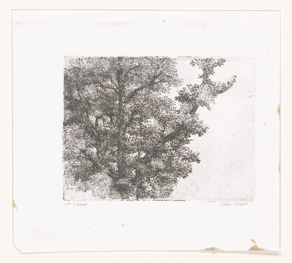 Max Josef Wagenbauer made this print, "Silhouetten van boomtoppen," using etching. This study of treetops emerges from the late Enlightenment in Germany when the project of classifying nature was fashionable across scientific and artistic disciplines. Botanical illustration was a developing academic and artistic field, with institutions and academies codifying styles and techniques. Wagenbauer’s print partakes in the social and institutional history of German Romanticism, when a reverence for nature was coupled with scientific inquiry. Consider how the artist balances aesthetic beauty with accurate botanical representation. The composition itself reflects a desire to categorize and understand the natural world through visual means. To delve deeper, research the art academies of the period, and the botanical publications that were circulating in Germany at the time. These resources will provide a richer understanding of how Wagenbauer's work fits within the broader context of scientific and artistic exploration during his time.