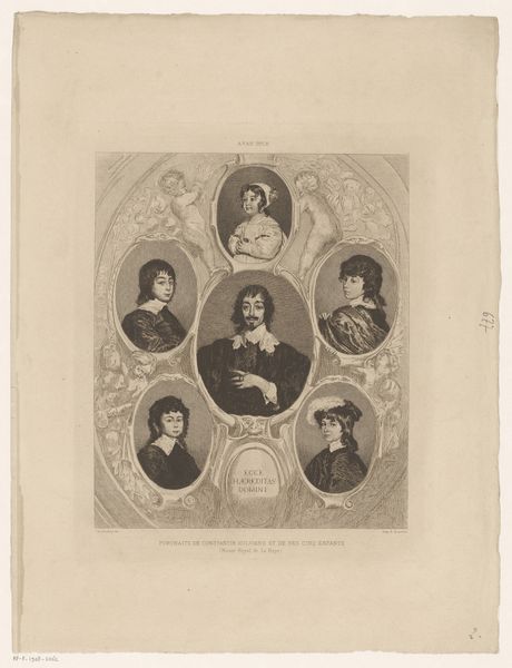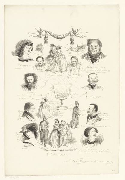 Editor: This lithograph, "Portretten," from 1856 by Petrus Josephus Lutgers, feels like a historical document. It’s a collection of faces, almost like a class photo from another era. What strikes me is how varied the expressions are, from stern to almost playful. How do you interpret this assembly of portraits? Curator: The collection immediately reads as a deliberate arrangement of archetypes. Look at how certain faces are emphasized in size and placement. Do you notice how that central male figure's open gaze contrasts with the woman beneath him, whose downcast eyes suggest humility? Editor: Yes, I see that now. Is it about contrasting ideals, maybe of masculinity versus femininity at the time? Curator: Perhaps, but let’s also consider the less obvious. The individuals surrounding them act like witnesses. What collective narrative could these faces represent, arranged almost as a family tree or societal hierarchy? It appears carefully staged with a blend of status and roles from that period. Editor: So, it's not just a random gathering but a curated snapshot of societal roles and power dynamics. I hadn't considered how consciously Lutgers might have positioned everyone. Curator: Exactly. And each face, though rendered realistically, becomes a symbol within this carefully constructed scene, resonating with beliefs and power structures of 1856. They reflect an intricate, codified cultural memory. Editor: I see it! I initially overlooked the powerful way the symbols conveyed meaning. Thanks. Curator: And I have you to thank for encouraging me to reflect upon those collective ideals and historical narratives embedded in the faces we observe.