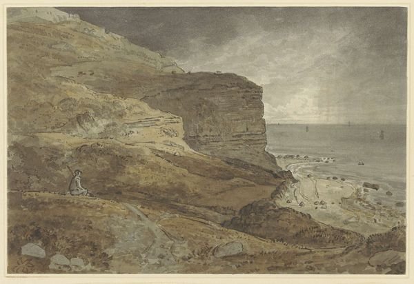 Curator: This monochrome wash drawing is by George Chinnery, who was born in 1774 and died in 1852. It currently resides in the Tate collections. Editor: The composition strikes me as quite turbulent. The rough seas, the jagged rocks… there’s a distinct lack of serenity. Curator: Chinnery was known for his depictions of life in India and China, and such coastal scenes often symbolized journeys, both literal and metaphorical, suggesting the transient nature of life. Editor: The linear perspective is definitely intriguing here. The eye is led across the water, punctuated by these precise junks, towards the distant hills. The material qualities suggest a spontaneity, a sketch-like immediacy. Curator: Indeed. The sails of the boats are a recurring motif in his work, perhaps representing hope and progress, but also the vulnerability of human endeavors against the vastness of nature. Editor: It’s a compelling work, though the monochromatic scheme mutes a lot of the potential emotional impact. Curator: Perhaps, but it also lends the scene a timeless quality, stripping away the immediacy of color in favor of a deeper reflection on the human condition. Editor: A fresh perspective, thanks. Curator: My pleasure.
