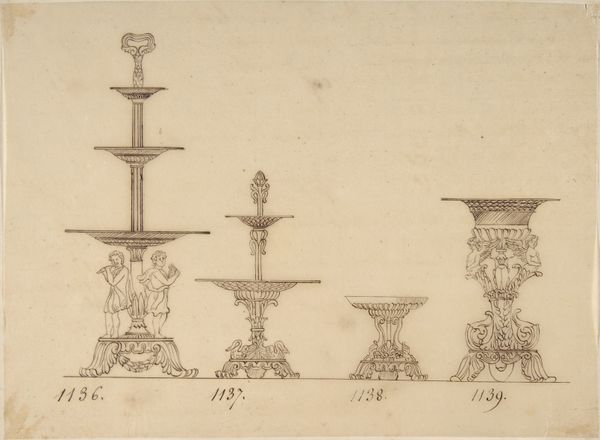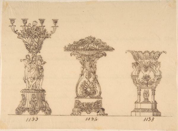 This is a pen and ink drawing for a sconce and two candelabras, made by an anonymous artist. The design features ornate, classical motifs, indicating its possible origin in 18th-century Europe, when a revival of classical forms in art and architecture was in vogue. The drawing provides insight into the decorative tastes of the upper classes, who would have commissioned such elaborate pieces for their homes. It demonstrates how art and design were deeply intertwined with social status and wealth. The lack of information about the artist and precise dating highlights the role of institutions such as museums in shaping the narrative around art. Understanding the social and economic context is vital for interpreting the significance of such designs. We can look into archives of decorative arts, period inventories, and design pattern books to better understand the cultural milieu that gave rise to such work.