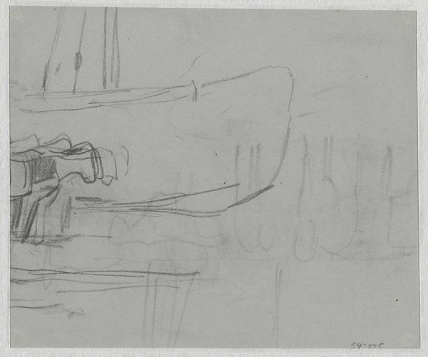 Curator: We are looking at "Figuren op een kade" which translates to "Figures on a Quay," a pencil drawing made between 1893 and 1899 by George Hendrik Breitner. It's part of the Rijksmuseum's collection. Editor: Immediately, I'm struck by the sense of movement despite it being a static image. The loose lines give the figures a dynamic, almost fleeting quality. It reminds me of capturing a memory just as it starts to fade. Curator: That impression aligns with Breitner’s practice. He moved away from the traditional studio setting to capture street scenes of Amsterdam. His art became an unvarnished reflection of the urban experience. Editor: I see figures, perhaps dockworkers, but they are presented without idealization, rendered with rapid strokes, conveying weariness, which may carry an unspoken cultural weight for that period and milieu. Curator: Exactly. Breitner was drawn to capturing working-class life, especially scenes around the docks, depicting them as part of Amsterdam’s urban fabric. These quick sketches often served as studies for larger paintings. There's a debate, though, about how he positioned himself: as an engaged observer or a more detached documentarian. Editor: It is like visual note-taking with its sense of immediacy! Are there other symbols used by Breitner here that speak to labor, movement, or even the coming of the modern age? I see lines and angles but also round shapes like heads bowed from work. Curator: Beyond the generalized depiction of dockworkers as urban subjects, it's hard to extract any distinct symbolism beyond Breitner aligning himself with artistic and social circles valuing working-class representation. The real symbolism, I think, lies in the shift itself, making previously unrepresented lives visible in the art world. Editor: I see, it's more about what the scene represents within a broader historical narrative rather than a set of symbols with fixed meanings. It prompts consideration of societal and economic factors. Curator: Indeed, and also the developing identity of the art world at the time! He positioned himself in the contemporary moment, which required an entirely new visual language! Editor: A glimpse into another world that opens onto grander concepts! I was stuck at its lines, so now I will come away looking closer at the shapes themselves, like labor. Curator: Well, this particular drawing speaks about capturing reality without idealizing it or mythologizing it, an idea that transformed art as much as those very transformations of the world he drew!