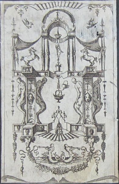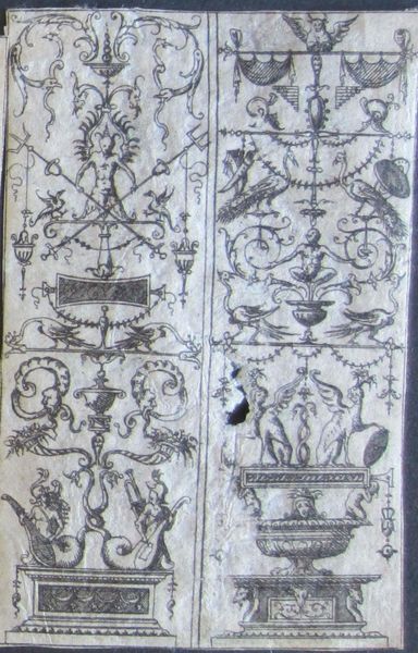 Curator: This is an engraving by Jacques Androuet Du Cerceau, titled "Two Grotesques Separated by a Band of Ornament, the Grotesques Springing from Elaborate Vases." Editor: It's like a fever dream made of architectural whimsy! What a riot of strange figures emerging from vases. Curator: Du Cerceau was a master of ornament, crucial in disseminating Renaissance style through prints. These grotesque designs would have inspired interior decorations. Editor: I’m especially drawn to the central band. Those figures holding up the pavilions seem crushed, but I admire their stoicism! It’s darkly humorous. Curator: Absolutely. These images reflect a complex period, where classical ideals mingle with a fascination for the bizarre. Du Cerceau captures that tension beautifully. Editor: You know, staring at this makes me want to design wallpaper…or maybe just take a nap. Curator: A perfect blend of form and fancy, Jacques Androuet Du Cerceau’s work continues to fascinate.
