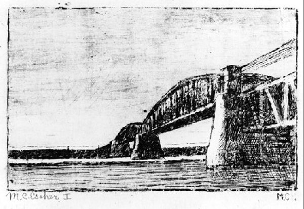 Editor: Here we have M.C. Escher’s "Railway Bridge Across the Rhine at Oosterbeek," made around 1917. It’s an etching, a print made with ink. There's a definite somberness in the shades, a kind of structural elegance in the composition, what do you see? Curator: Formally, I observe a distinct arrangement of linear elements. Note the artist’s meticulous attention to perspective, creating depth and a sense of spatial recession. Observe also how the contrast in textures delineates space, further structuring the composition, would you agree? Editor: I do. I guess what strikes me is how Escher manages to create this robust, industrial image with such delicate lines. What does that juxtaposition mean for the piece? Curator: Precisely. The juxtaposition invites contemplation on the essence of form itself. Escher meticulously deconstructs the subject, presenting it through the language of line and tone. Do you find that Escher is attempting to draw the viewer’s eye to specific structural or semiotic relations within the subject of the landscape? Editor: The bridge definitely commands attention, even the river. It almost becomes background even with the detailing, everything is arranged in a kind of hierarchy through this language. Curator: A hierarchy, precisely. Note also how the varying weights and densities of the lines define depth and distance, while simultanesouly drawing us to consider the overall image structure, this tension is, itself, a source of contemplation. Editor: So it is through this line and its tension with the forms, Escher’s is revealing and highlighting the structures present. Curator: Precisely, a very elegant example of form. Editor: Yes, looking at it this way highlights how powerfully Escher can play with perspective using such relatively simple components, such as line and composition, even at the beginning of his career.