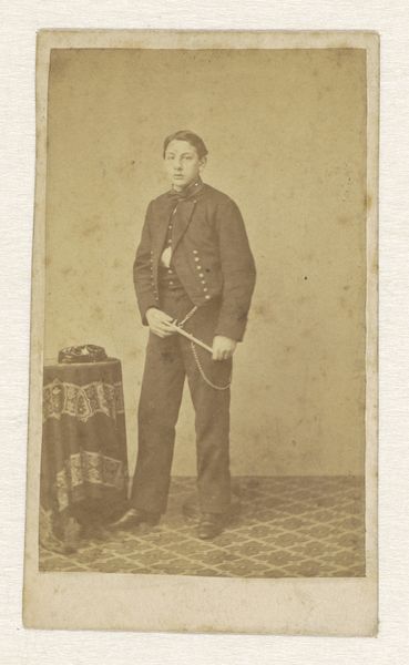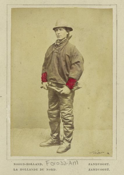Curator: This is a wonderful example of 19th-century photography. The Rijksmuseum holds this albumen print titled "Portret van een onbekende visser uit Scheveningen, Zuid-Holland", placing its creation somewhere between 1860 and 1890. Editor: It's striking, a somber tableau. The backdrop suggests a cultivated landscape, an odd juxtaposition to the fisherman’s rather rough-hewn appearance. There's a clear contrast being presented, though what does it mean? Curator: Indeed. The composition follows a classical portrait arrangement—the subject is centered, filling much of the frame. Consider the tonal range; the photograph uses soft gradients to describe volume and texture. It highlights not only the material reality but the play of light across surfaces. Editor: Yet that idealized background clashes, I think, deliberately, with the man's lived reality. He's dressed in his work clothes, complete with wooden shoes. He holds a basket, perhaps of wares. Look closer, and one sees the fatigue etched into his face— the photo speaks to the exploitation of labor inherent to industrializing societies and the romanticization of the "common man" during that time. Curator: A compelling interpretation! From my perspective, his clothing details, like the color and the stitching, reinforce its formal aspects. Even the texture of the albumen print lends it a depth beyond pure representation; consider how light and dark are organized, creating emphasis via chiaroscuro. Editor: I understand. But isn’t this photographic tradition complicit in creating and reinforcing stereotypes? Consider who commissioned this image, and for what purpose! We must examine how power dynamics influence representation, considering issues of class, labor, and social identity. This isn’t merely a "portrait"; it’s a cultural artifact loaded with the assumptions of its era. Curator: An argument to which there are no easy answers, especially regarding artistic intent that's permanently lost to us! For me, this photographic print remains an interesting technical example of a developing visual medium that captures a fleeting moment. Editor: Perhaps we can agree it offers a powerful lens through which we can view both photographic technology and the sociopolitical landscape of 19th century Holland, especially how laborers were regarded at the time.
