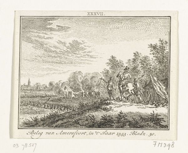 Curator: I'm struck by the dynamism despite the stillness, the broken bridge creating a dramatic visual divide. Editor: Indeed. We're looking at "Civilis en Cerialis onderhandelen op de afgebroken brug, 69-70," an engraving made with ink on paper dating from 1756-1758, the creation of Simon Fokke. It’s a really interesting depiction of this historical moment. Curator: The landscape backdrop frames a tense negotiation. Consider the power dynamics at play: this image speaks to a long history of colonial encounters and resistance. Here is Civilis, leading a Batavian revolt, facing down the might of the Roman Empire, the broken bridge perhaps serving as a physical metaphor for a fractured and uneasy power. Editor: I see it also as an artful construct, literally. The meticulous linework, that almost obsessive detail in rendering textures – look at the clothing folds, the beards – reinforces the theatricality of the moment. There's an almost symmetrical composition to the bridge ends that focuses our gaze. Curator: It highlights the art of diplomacy, right? Both sides are poised, staged. Civilis and Cerialis extend their arms, mediating in front of assembled representatives, a tableau vivant. What conditions enabled the need for mediation; how are individual and collective power expressed visually? This image makes those questions present. Editor: Though an engraving, it nearly transcends the limitations of the medium, achieving an evocative atmosphere. It almost vibrates with narrative possibilities. The stark light and dark interplay generate a stark tension. Curator: Exactly. The piece prompts critical inquiry into how power negotiations were framed and interpreted historically. It reveals more than just an historical event; it reveals a specific worldview and its assumptions about power. Editor: The composition certainly guides our reading; the ruptured bridge is visually compelling and reinforces the symbolic fracture. It leaves the viewer to determine if these actors reach resolution. Curator: It's a stark reminder that these seemingly distant historical events echo contemporary debates about identity, autonomy, and resistance, urging viewers to engage with historical contexts and grapple with lingering questions of power. Editor: I see now the piece achieves both aesthetic mastery and depth of thought—a really compelling combination.