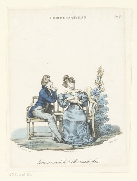 This is 'The Two Strings', a hand-colored etching by the British artist John Leech. The scene depicts a woman in a pink dress sitting between two men in a well-to-do interior. Leech was a prominent caricaturist for the magazine Punch in mid-19th century Britain, a period marked by rigid social conventions and class consciousness. With its title, this image uses visual codes to critique the marital customs of the British middle class, satirizing the pursuit of multiple romantic interests as a sign of social and economic aspiration. Note how the artist uses the woman’s placement and expression to highlight her ambiguous role. To fully understand this artwork, we might consult Victorian periodicals and conduct archival research into the social history of courtship. The meaning of 'The Two Strings' is contingent on the cultural norms and institutional structures of its time.