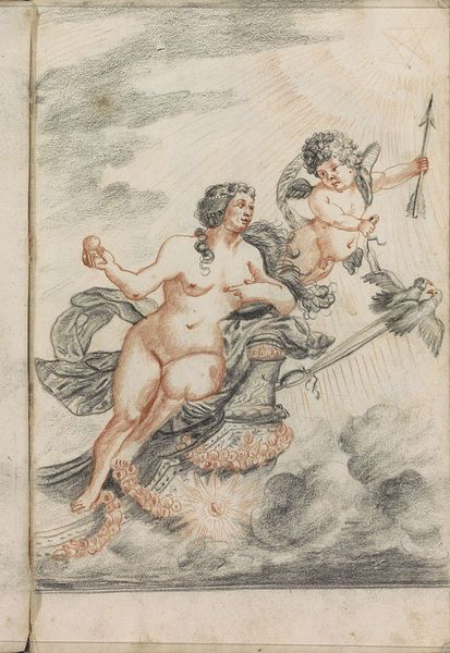 Curator: The delicacy is striking; a study in ink on toned paper attributed to Giovanni Antonio Pellegrini, created sometime between 1675 and 1741. It depicts the Virgin Standing on Clouds, holding a scapular. Editor: It does have a dreamlike, almost ethereal quality. The lightness of the line work gives her an ephemeral presence. How interesting, also, that it's just a sketch, a moment caught on paper. Curator: Precisely. These types of drawings are crucial for understanding the baroque era workshop practices. We get a glimpse into Pellegrini’s creative process, the methods he employed to refine compositions before committing them to a larger-scale painting or fresco. Notice the economy of line and the subtle washes; he used them to suggest form and texture efficiently. Editor: I’m curious about the choice to portray the Virgin with a scapular. Considering the social climate of the period, what kind of relationship with institutions, religious or otherwise, does it reflect, and what impact would such an image have in a context steeped in faith, belief, but also, perhaps, some form of struggle? What did the access to the artwork require then? Curator: That’s an insightful observation. The inclusion of the scapular directly relates to the lay confraternities and their devotion. The distribution of scapulars by religious orders offered tangible participation, uniting diverse social classes through accessible devotional objects, usually textiles. Its presence suggests not just religious piety, but social and economic ties to specific communities of faith and possibly the commissioning structures in place at the time the artwork was being created. Editor: So, it functions as both a spiritual symbol and a marker of collective identity and even possibly points toward access and material interactions! These objects can serve as potent signifiers of belonging, a visual assertion of shared values, that may in a way undermine notions of high art vs folk art. I find myself reflecting on the function and the many lives it touched during and after the moment of creation. Curator: It is a small glimpse into a world of production and material faith. Editor: Indeed; and from that perspective, these small scale intimate artworks such as this ink on toned paper by Pellegrini serve as great social artifacts.