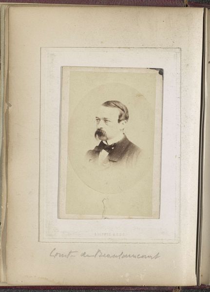 Curator: Let's consider this gelatin-silver print, a "Portret van een man" created between 1863 and 1871 by Willem Cornelis van Dijk. What are your initial impressions? Editor: It's immediately striking how… contained he seems. That small oval vignette makes him feel almost like a specimen, pinned down for observation. The limited tonal range contributes to a serious, contemplative mood, don't you think? Curator: Yes, the oval shape lends itself to that sensation of preservation, much like ancient Roman portrait busts or even early Christian medallions. It draws from a deep well of history when capturing likeness. Observe his high collar; that also contributes to a sensation of constraint, evoking codes of dress and presentation associated with that era. Editor: Right, he is someone performing formality, carefully enacting a version of masculinity for the camera, carefully calibrated through grooming, dress, and composure. I can’t help but wonder about what this image was actually *for.* A keepsake? An advertisement? A statement of presence? Curator: Very likely for familial connection. Photography at this stage was largely a domain of recording and remembrance, wasn't it? His sharp gaze, while posed, invites a consideration of status. The way his eyes fix us creates a space of power and legacy that families want. These objects became testaments. Editor: It really does underscore how photographs quickly become relics, invested with more and more importance and memory with the passage of time. The subject of the photo vanishes, the world that created it changes irrevocably, but the image remains, stubbornly resisting oblivion. Isn't that just a little spooky? Curator: I agree entirely, especially with a photograph. I can easily imagine this portrait, carefully arranged in an album or even a locket. His image, so self-consciously presented, then privately shared through touch between members of his family—what more durable symbol is there? Editor: Well said! It makes me see beyond the stiffness to the yearning for connection this little portrait holds within it. I am so glad to hear more. Curator: Thank you for bringing your perspective to this consideration.