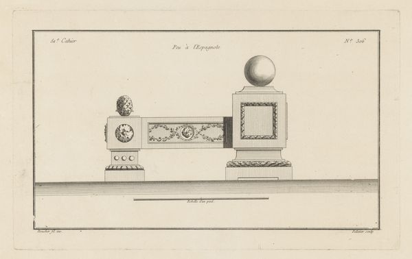 This drawing by Jean Pelletier shows a design for a fire dog with a vase, rendered with delicate lines. The most striking feature is the vase adorned with putti, cherubic figures embodying innocence and love, symbols that stretch back to classical antiquity and reappear during the Renaissance. Vases have long been associated with funerary contexts and were used by the Greeks as grave markers, decorated with scenes from everyday life and mythology. These were not just objects; they were vessels of memory. Notice the mask beneath the vase; it evokes the grotesque masks used in ancient theaters to amplify emotion. Here, this motif reflects a fascination with classical forms, embodying both beauty and an underlying tension. This echoes a primal fascination with confronting mortality and transformation. The symbols remind us that human experiences are eternally present, as the echoes of the past resonate in the present.