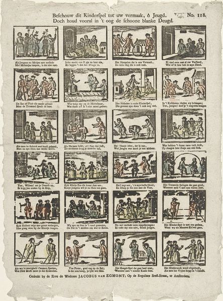 Editor: This woodcut print, "Zo Jongens komt met hopen," created by David Du Mortier & Zoon between 1789 and 1855, depicts a series of small scenes. It gives off this feeling of everyday life in the past but they seem to narrate a sequence of actions... it is all quite fascinating! What do you make of it? Curator: Indeed! This print gives us a fascinating glimpse into popular culture and visual storytelling of the period. What strikes me is the overt commercial aspect. Notice the full title – it practically screams at viewers to buy these affordable prints. It frames the consumption of imagery as part of everyday life. Editor: I hadn't even noticed that. So this was like, street art? Commercials on paper? Curator: Something like that, yes! In fact, the printing process allowed images and narratives to reach a broader audience beyond the elite. These kinds of prints would be sold and circulated among the common people, embedding into popular consciousness specific representations and perhaps even shaping behavior. Where do you think such visual stories originated? Editor: Well, genre painting, as they call it, has often focused on scenes from daily life; from festivals to taverns, markets... and if you think about the title it all suggests common life. Do you think these are all different stages of "Leve van Spring in 't Veld?" Curator: That's an interesting observation. In addition to the print offering some insight to social events and culture in Leiden it would make sense for the scenes shown here to possibly all relate to "Spring in 't Veld's Life". Prints like these demonstrate a fascinating interplay between commercial interests, popular narratives, and social representation. It speaks to how images circulate within a community. Editor: This was incredibly insightful. Now, looking at the artwork through a more historical, almost societal lens, helps appreciate art beyond just aesthetics.