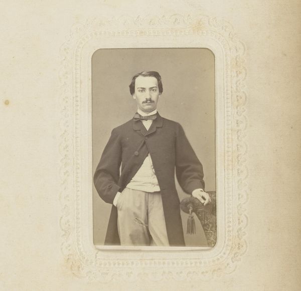 Editor: Here we have "Portret van een staande man met boek in de hand", taken between 1860 and 1900 by Ernst Schroeter, using photography. What strikes me most is how this academic portrait invites curiosity. What unspoken stories do you find within this portrait? Curator: The book, presented so deliberately, serves as a potent symbol. Beyond its literal presence as an object of learning, it signifies status, intellect, and the cultivated inner world of the sitter. Consider how this carefully constructed image might project an aspired-to identity. Is it a simple signifier of education or does it represent more nuanced concepts? Editor: That's fascinating. It definitely gives the impression of someone who values knowledge. Is there any additional context in how books, as props, reflected something about the sitter, at that time? Curator: Indeed. In the 19th century, literacy was growing, but access to knowledge and books was still a privilege. Presenting oneself with a book visually declared membership in an educated class, implying a dedication to personal and intellectual growth. Furthermore, notice his posture and the soft light. How do those elements contribute to the narrative? Editor: Good point, it’s definitely posed and the controlled light lends itself to making him appear trustworthy, thoughtful... respectable! It's interesting to think about the layers of meaning a seemingly simple portrait holds. I hadn’t considered the broader social context reflected by the inclusion of the book. Curator: Exactly. Images become potent symbols over time, reflecting evolving cultural values. Looking closer we appreciate photography's potential as a means of symbolic representation. Editor: This conversation made me see this portrait not as a picture but as a considered projection of social standing. Thanks so much for this reading.