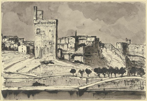 Curator: Here we have Joseph Pennell's "Storm behind the Acropolis," a pencil drawing, also presented as a print, created in 1913. Editor: Woah, that’s moody. I mean, even without knowing it’s called “Storm Behind…” there’s this definite sense of dramatic weight looming over the whole scene. You feel the energy of that impending storm. Curator: Indeed. Pennell uses contrasting pencil strokes to establish a hierarchy in the image, and it is a well-balanced example of academic-art principles applied to cityscape renderings. The dramatic sky becomes as crucial as the subject, as a form of negative space through composition and contrast. Editor: It almost feels Romantic in that way, the sublime power of nature dwarfing even these monumental architectural achievements. The Parthenon becomes vulnerable, not eternal. Look how delicate Pennell makes it with those fragile lines; it’s all pencil dust and light. Curator: Quite, the delicacy derives from a strategic manipulation of the medium to emphasize not the bulk and material of the building, but to present its image—the aesthetic appreciation, rather than documentation. And this provides another lens on thinking about classical idealism and its legacy. Editor: I agree that there is a layer there on perception and historical legacy. Still, though, something about those sketchy pencil lines gives the sense that even stone is fleeting and temporary. I almost hear the rumble of thunder and feel the breeze picking up looking at this. I guess for me that immediacy is the powerful part. Curator: An intriguing counterpoint to the structured approach of formal academicism in Pennell's approach to the picture plane and tonal gradations across it. Editor: In the end, I’m still mostly struck by how dramatically the sky seems to speak! What began as historical monument slowly shapeshifts into a study in atmosphere. Curator: Indeed. It serves as an excellent study in medium manipulation and the ability of this choice to communicate historical commentary within a static, ostensibly objective medium.