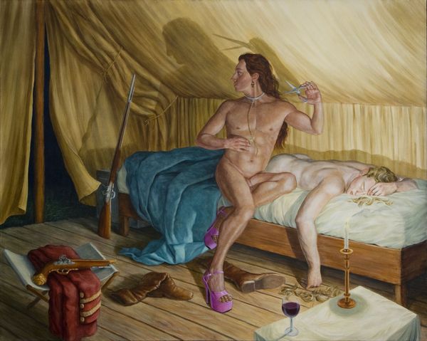 Editor: This oil painting is "The Spider and the Fly" by Nigel Van Wieck. It presents a very charged and intimate scene, but I'm also struggling to place it within a particular art-historical movement. The nude figure recalls historical paintings, but the style feels more contemporary. What do you see in this piece that might help me understand its context? Curator: It’s fascinating, isn't it? I find the title incredibly telling. "The Spider and the Fly" immediately conjures up this idea of predator and prey, manipulation and entrapment. Thinking about its place in art history, and given that we don't have a specific date for this work, what art movements from the late 20th century come to mind? Ones where artists grappled with complex narratives and revisited older styles with a critical eye? Editor: I'm wondering about Neo-Expressionism because of its focus on subjective emotion and the raw application of paint, but there's also something about the setting that reminds me of Romanticism's interest in heightened drama. Curator: Precisely. Neo-Expressionism definitely informs the approach, the raw quality is evident, yet the classical, even theatrical, setting—the draped bed, the suggestive poses—creates an intentionally staged drama reminiscent of Romantic tableaux. Consider also the social context: what does it mean to depict a nude woman in the late 20th/early 21st century? What is Van Wieck suggesting about power dynamics or gender roles in such a personal setting? Is this merely voyeuristic, or is he critiquing something? Editor: So the tension between the artistic styles is there on purpose, serving as a question for the audience. Curator: Exactly. He's engaging with art history, specifically representations of women, while simultaneously making a statement about contemporary relationships and societal power structures. It reflects our own anxieties and expectations. Editor: This piece makes me consider how historical context drastically changes the impact of what feels like a very traditional depiction. I now see beyond a single emotion to grasp that broader cultural question. Thank you for sharing your perspective!