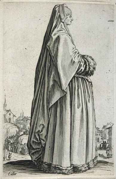 Editor: This is Jacques Callot's "Beggar Man with a Rosary." The etched lines create a figure of apparent poverty. What can you tell me about the image in relation to its historical context? Curator: Callot’s image, likely created between 1622 and 1635, depicts a marginalized figure at a time of significant social and economic upheaval. Consider the public perception of poverty in 17th-century Europe and how Callot's work might reinforce or challenge those views. Editor: So, was Callot making a social commentary? Curator: Precisely. Etchings like this were often circulated widely, making them powerful tools for shaping public opinion and reflecting on the socio-political structures of the time. Reflect on what this image tells us. Editor: It provides a glimpse into social realities. Curator: Yes, and highlights the complex relationship between art, power, and representation.