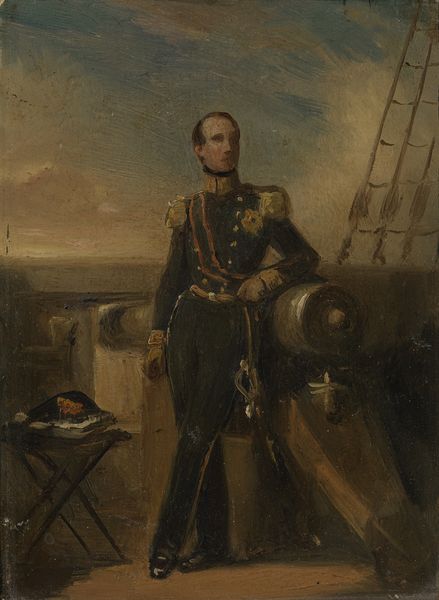 Editor: This is Jan Adam Kruseman's "Portrait of William II, King of the Netherlands" from 1839. It's grand and regal, fitting for a king, I suppose. The dog looking up at him adds an unexpected warmth to the painting. What do you make of it? Curator: The dog, yes, is beautifully painted, so hopeful and adoring. It's there as a symbol of fidelity, I imagine, or loyalty perhaps? But there's something in William’s eyes that troubles me. Does he look as though he can be as loyal as this beautiful creature? Is there, perhaps, an uncomfortable arrogance that sits slightly uncomfortably with that animal at his side? Editor: I see what you mean about the arrogance. It’s in the posture, the confident crossing of the arms. Do you think Kruseman was trying to hint at a certain type of ruler? Curator: Perhaps, or maybe he saw it there anyway. Every portrait, you know, is a subtle negotiation between the painter and the painted. Who is in control? The painter with the brush? The person being portrayed with his own sense of self? The joy of great portraiture lies, perhaps, in that unspoken dialogue. Look at those heavy epaulettes too: wealth, power, a land, quite probably stolen, ready to be ravaged. What kind of King would *you* want to be if you could choose? Editor: I hadn’t thought of the epaulettes that way, but you're right; it is a lot of show. If I were king? Hmm, that’s a tough one! I think I’d try to rule with empathy and sustainability in mind. No ravaged lands. Curator: A queen after my own heart. And see, that's what art does! It makes us question; it makes us reflect and makes us re-imagine! This painting gives us not just a king, but an opportunity to imagine kings we might have needed and rulers, we pray, the world will embrace soon. It all stems from a single canvas... amazing!