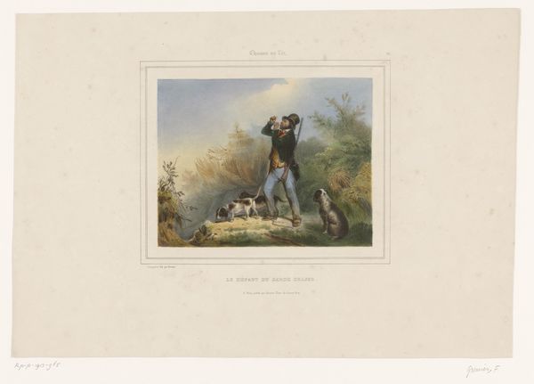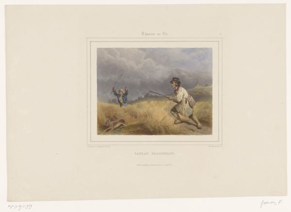 François Grenier created this print, titled 'Two Hunters Using a Bird of Prey,' sometime in the first half of the 19th century. It depicts two men poised to shoot, one pointing his rifle towards a bird flying in the distance. Hunting in this period was not merely a sport, but a social activity, especially among the landed gentry. Prints like this one provided a vicarious experience for those who were excluded from such pursuits, or served as a reminder of leisure time. We can think about the politics of imagery: who is being represented, how are they being represented and for whose consumption? This image reinforces the idea of man's dominion over nature, an ideology that was gaining traction during the Industrial Revolution. By examining hunting manuals, game laws, and even fashion plates from the period, we can gain a richer understanding of the social rituals surrounding hunting and how they reflect broader power dynamics in 19th-century society.