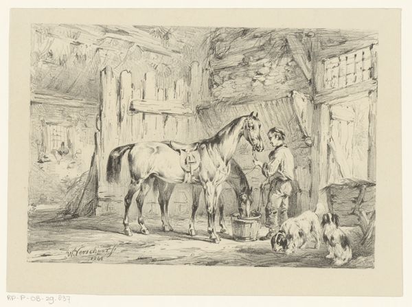 Anton Mauve made this watercolour called 'Horse in a Stable with an Open Door' using watercolour on paper. Observe how Mauve constructs the scene, with the horse acting as a vertical anchor. It is positioned slightly off-center, creating a visual tension that keeps the composition dynamic. The open door offers a glimpse into the outside world, drawing the eye through layers of depth. Mauve manipulates light and shadow to define the form and texture of the stable’s interior. The brushwork is loose, almost impressionistic, capturing the rustic and transient quality of rural life. This suggests a tension between stability and openness that perhaps reflects broader cultural anxieties about nature. Consider how the subtle manipulation of tone and texture conveys a complex interplay between concealment and revelation, inviting prolonged contemplation.