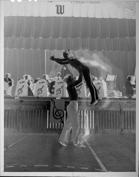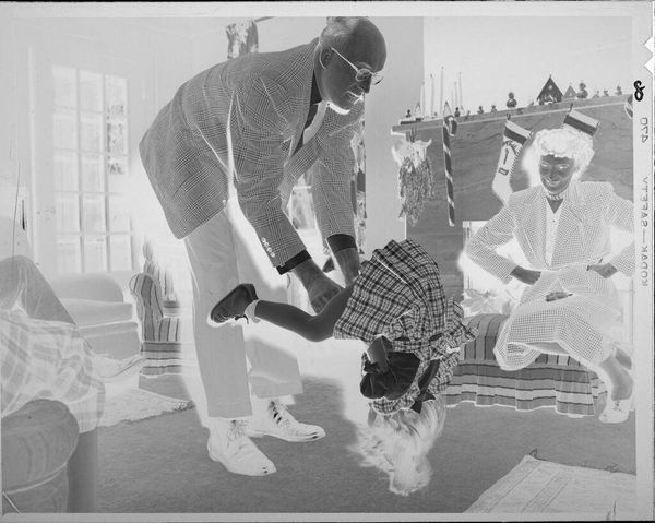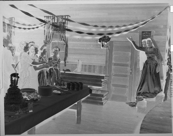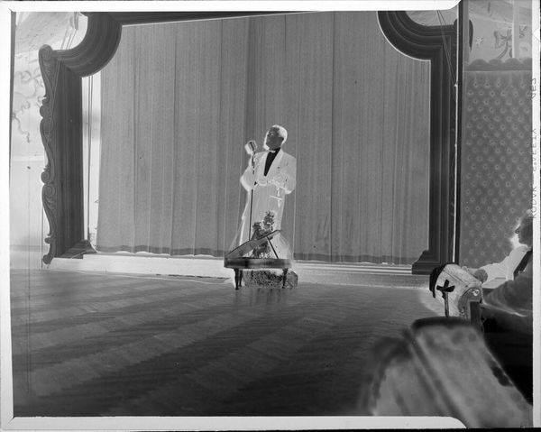 Editor: This photograph, "Untitled (performers on stage)" by Peter James Studio, presents a theatrical scene. Its negative format gives it an eerie, dreamlike quality. What emotional impact do you think this reversed tonality brings to the work? Curator: The negative image lends a ghostly quality. It recalls photographic techniques used to highlight social and political themes. Does the reversal affect how we read the narrative? The stage, the performers – are they symbols of transformation, of the hidden aspects of identity brought to light, so to speak? Editor: That's a thought-provoking point. It makes me wonder what the original image looked like and how that would change our perception. Curator: Precisely. The cultural memory embedded in images can shift with even slight alterations in form and context. Considering how often photographic images are manipulated today, understanding that shifting cultural memory feels more important than ever.