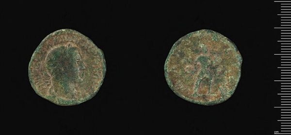 Curator: This is an Antoninianus of Claudius II Gothicus, a Roman coin currently held in the Harvard Art Museums collection. Editor: It looks worn, almost ghostly. I see a faint figure, but the details are obscured by time and corrosion. Curator: Indeed. These coins served not only as currency but also as imperial propaganda. Consider the imagery: the emperor's portrait on one side, a deity on the other. Editor: Propaganda, yes, but also tangible symbols of power circulating through society, impacting perceptions of leadership and divine right. What does it mean that this object, once so potent, is now fragmented? Curator: The coin’s degradation speaks volumes about the instability of power and the passage of time, shifting meanings shaped by socio-political conditions. Editor: Exactly. And how we choose to interpret these relics today reflects our own biases and power structures. Food for thought. Curator: Absolutely. It's a reminder that history is always a dialogue between past and present.