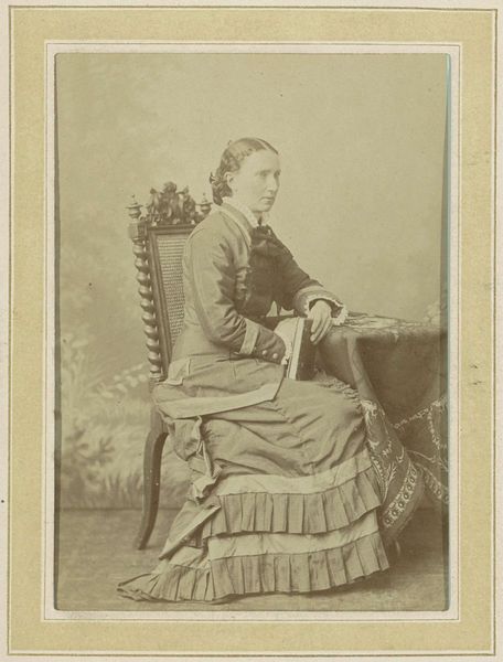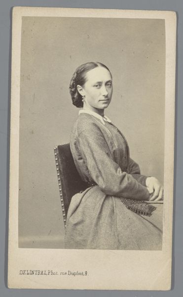 Curator: Here we have an albumen print by François Joseph Delintraz titled, "Portret van een onbekende jonge vrouw," dating from around 1859 to 1868. The sitter is poised in profile. Editor: It's rather melancholic, wouldn't you say? Something about the muted tones and her reserved posture gives the impression of quiet contemplation, even sadness. Almost like she's seen something of the world. Curator: Note the tonal range achieved in this gelatin-silver print, and how Delintraz masterfully manipulates light to render the details of her hair and clothing, and the subtle highlights accentuating the curvature of her jawline. The composition is rigidly conventional, with her face in a precise three-quarter profile view. Editor: Rigid is the word! But you know, in spite of that strict pose, her eyes, that sliver we see, they hint at something untamed. Almost mischievous. Like there's a whole other story bubbling beneath the surface. It feels cinematic. I half expect her to turn her head, arch a brow, and deliver some bon mot! Curator: Her outward restraint contrasts sharply with the detail given to rendering of fabrics – specifically her adornments. Her garment hints at a more ornamented lifestyle, adding visual complexity. Semiotically, such oppositions reflect internal dichotomies, hinting at deeper cultural tensions. Editor: Fascinating point! But tell me, looking beyond all that, does she stir anything in you? Does she whisper secrets of resilience, hidden behind social masks and rigid structure? Or am I just reading into it too much? Curator: I find that such speculation does lead one astray from direct aesthetic engagement, especially given the work’s materiality and structural elements. However, I will allow that Delintraz clearly had intentions toward more than simply accurately presenting this sitter. Editor: I wonder who she really was, our nameless lady. Perhaps Delintraz immortalized her, or even created something new in those careful gradations of gray and light? Whatever the reason, she has moved us!