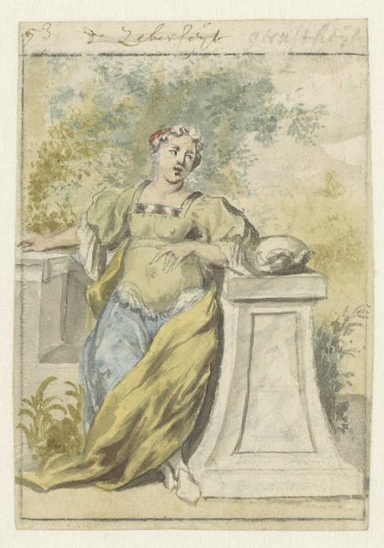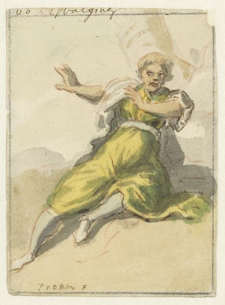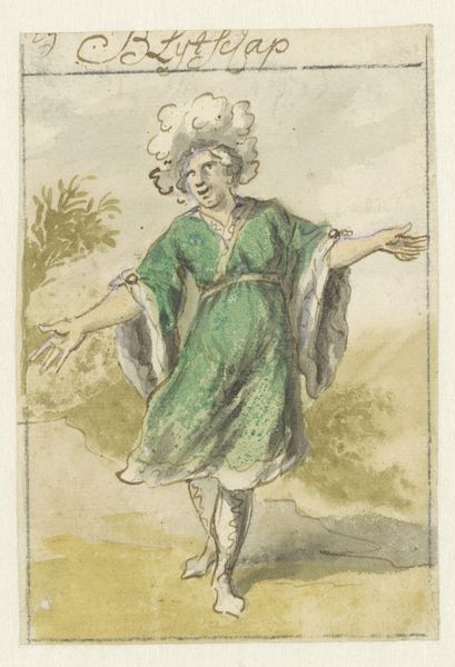 Pieter van den Berge created this watercolor titled "Lichaamssmart," or "bodily pain," on paper, sometime between the late 17th and early 18th centuries. Van den Berge applied thin washes of pigment to the paper, using the support’s absorbency to create soft, blended forms. You can see this particularly in the figure's robe and the suggestive landscape. The choice of watercolor, a medium prized for its delicacy and portability, speaks to a culture of travel and leisure. The artist engaged with traditions of academic drawing, landscape painting, and human figure studies. But he did so on a modest scale, emphasizing the artist's direct touch. Consider the labor involved in producing the paper and pigments, and in the artist's training and practice. Van den Berge’s "Lichaamssmart" encapsulates the intersection of skill, material, and cultural value in the creation of art. By considering these aspects, we can understand how it blurs the boundaries between craft, design, and fine art.