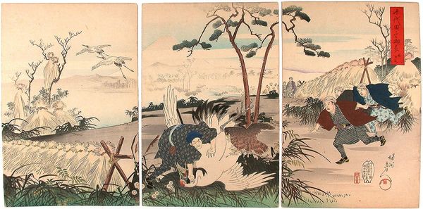 Editor: This is an image from "KachÅ gaden" by Katsushika Taito II, it seems to be a woodblock print. I’m drawn to the simple lines used to depict movement. What do you see in terms of the artist's process? Curator: The woodblock printing process is crucial here. Consider the labor involved in carving each block for different colors, and how that process shapes the final image. This wasn't just artistic expression, but skilled labor within a specific economic system. Editor: So, the material and means of production tell a story beyond just aesthetics? Curator: Absolutely. We can also analyze the consumption of these prints. Who was buying them? How did they circulate? The materiality of the print links directly to its social life. Editor: I hadn't thought about it that way. Seeing the artwork as part of a larger system makes it much more interesting. Curator: Exactly! It’s about labor, materiality, and consumption.