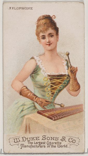Curator: This is "Clarinet, from the Musical Instruments series (N82) for Duke brand cigarettes," dating back to 1888. It’s a print, made using colored pencils, produced by W. Duke, Sons & Co. Editor: Well, isn't she charming? She looks like a candy cane came to life and decided to learn the clarinet. There’s a sweetness, a kind of frivolous joy about her. Curator: The piece comes from a series of collectible cards distributed with Duke cigarettes. It served as an advertisement, obviously, but also tapped into a late 19th-century vogue for collecting these cards which depicted actresses, sports figures, and in this instance, musical instruments. The series reflects the rising popularity of both tobacco consumption and the consumer culture surrounding it. Editor: I love how un-real she seems! That wasp waist! The determined little pursing of her lips around the clarinet's mouthpiece, all very…studied? Staged? Like she's acting at being a musician. Curator: The aesthetics definitely borrow from both the Art Nouveau and Japonisme movements, especially in the flattening of perspective and decorative patterning in her dress. These influences gave commercial art a veneer of sophistication, attracting a more discerning clientele. Editor: She looks more ready for a tea party than a symphony hall. But maybe that’s the point. The connection between glamour and lifestyle that the advertisement hopes we'll connect with Duke's Cigarettes. Curator: Precisely! It wasn't necessarily about the realities of playing a musical instrument but creating an aspirational image connected to pleasure, luxury and, well, "the good life," as marketed by W. Duke, Sons & Co., “The Largest Cigarette Manufacturers in the World!" Editor: I guess what resonates with me is the odd disconnect between her gentle portrait and that bold capitalist message bellowing from the bottom. It's the clash of high art ambition meeting a crass commercial goal. The art here to subtly endorse the tobacco, knowing full well the harm. Curator: Exactly! It reveals the complex social and economic dynamics that shaped the art and design of the period. It offers a glimpse into the relationship between industry, advertising, and art as the definition of what is deemed fine art, design and illustration becomes ever more distinct and important. Editor: What starts as an amusing little image unfolds into a richer story about a past era when industry promoted, through design, consumer desires for a certain lifestyle. I find that intriguing and useful to keep in mind.