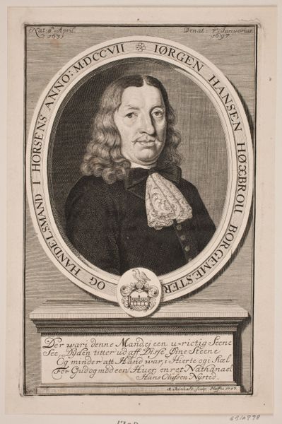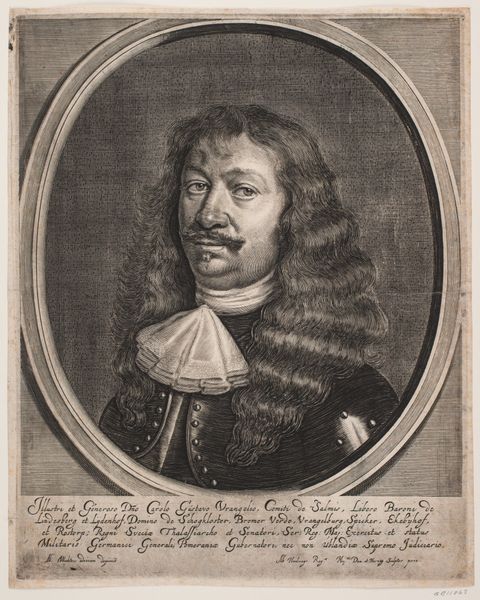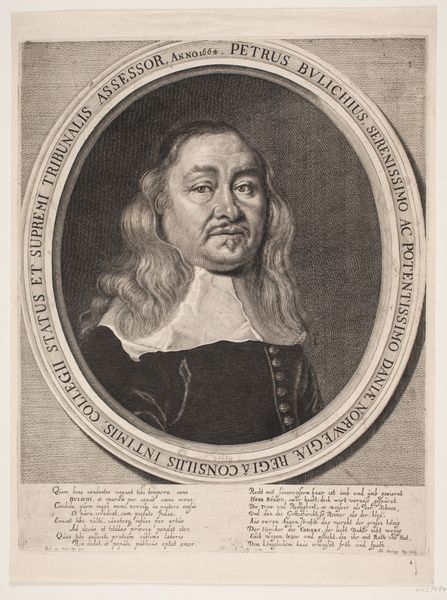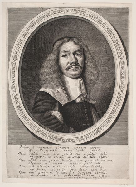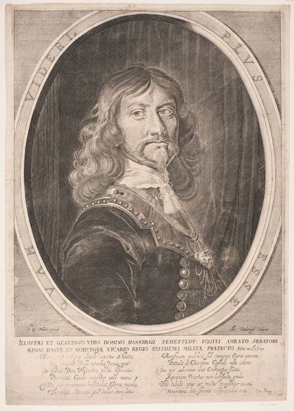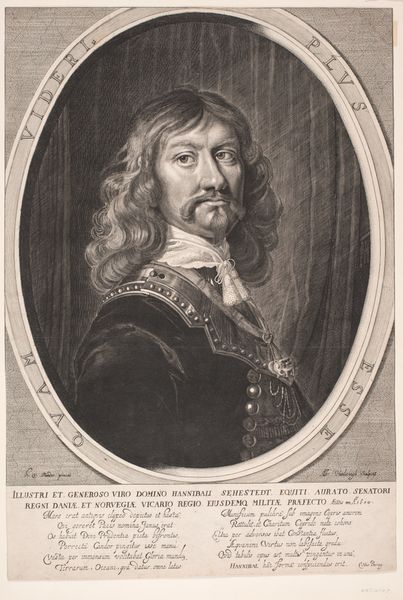 This portrait of Christian Rantzau is an engraving by Albert Haelwegh, made sometime in the 17th century. The oval composition, framed by Latin inscriptions, draws your eye to the figure's assured gaze. The texture achieved through fine lines creates depth, particularly in the rendering of Rantzau's hair and clothing. Notice how Haelwegh uses the formal structure of portraiture to convey status and identity. The lines of the engraving, though delicate, articulate a clear hierarchy. The visual weight is distributed evenly, maintaining balance. The stark contrast between light and shadow not only models the forms but also infuses the image with a sense of drama befitting the sitter’s position. The meticulous detail and structured layout speak to a period deeply engaged with representation and the semiotic power of images. It embodies an era grappling with new ways of perceiving space, power, and the very idea of representation. This enduring print invites us to reconsider how formal elements intersect with cultural meanings.