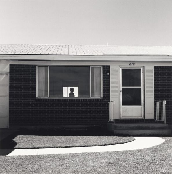 Curator: Let's turn our attention to Robert Adams' photograph, "Longmont, Colorado," which he likely captured between 1973 and 1990. What strikes you about it? Editor: There’s a stark stillness. The composition, the tonal range... it almost feels like a stage set, but utterly devoid of drama. The greys are exquisitely rendered, almost clinical. Curator: Adams often explored the evolving landscape of the American West and its impact on communities, and here, the gelatin-silver print serves as a powerful medium. It's a study in the banality of the everyday, yet beneath that is a pointed commentary on suburban sprawl and its impact. Editor: I find it’s the geometric balance that holds my attention – the horizontality of the house contrasting with the soft, almost dreamy sky. There's a precision in the alignment of the windows and roofline that belies any sense of spontaneity. Is he finding beauty, or something else, in this architectural monotony? Curator: Think of the labor involved. The photographer, the photographic paper manufacture, the house building with its construction workers. What kind of human condition has led us to these houses? Adams aimed to confront our relationship with this altered land; the very act of photographing becomes a form of intervention. It is not beautiful, but useful, perhaps. Editor: Intervention? Or documentation? Perhaps beauty resides in the truth exposed. Observe how light defines space; the slight glow emanating from the doorway draws you in. Consider the texture of the brickwork against the smoothness of the lawn. It is these subtle contrasts, and the precise composition, that reveal the aesthetic strength of this piece. Curator: I see Adams pointing to our collective complicity in environmental degradation. Editor: Whether indictment or simple observation, I concede that there is undeniable formal rigor that forces one to truly *see* the architecture, the details of that moment and location. Curator: Indeed. “Longmont, Colorado” prompts us to look closely and question the very structures—both physical and societal—that shape our world. Editor: Ultimately, it reminds us of photography’s inherent power— to stop time, frame reality, and reveal something about the way we exist in and perceive the world around us.