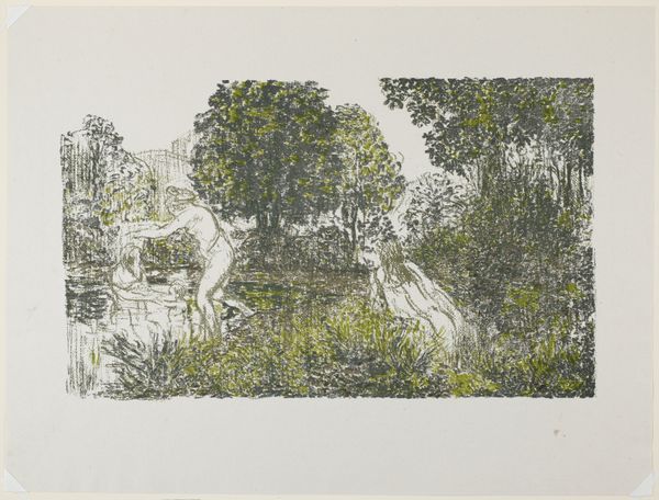 Curator: This is Ker Xavier Roussel's "Woman in a Striped Dress," residing here at the Harvard Art Museums. Editor: It's so ethereal! Almost like a daydream caught on paper, a fleeting memory of summer. Curator: Indeed. Roussel masterfully balances form and looseness. The woman, though central, merges with the verdant landscape. Note how the stripes echo the verticality of the trees. Editor: It is like she's not separate from the landscape, or perhaps she is fading back into it. I wonder who she is, and what she is thinking. Curator: Roussel, deeply inspired by mythology and nature, often depicted figures in harmonious settings. His work blends symbolism and sensuality. Editor: Well, it certainly makes you want to step right into that scene. A perfect world, right there.