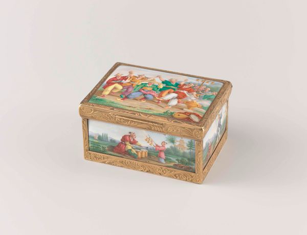Curator: Let's turn our attention to this exquisitely detailed snuffbox, made around 1769 or 1770 by Louis Roucel. It's a stunning example of Rococo artistry, currently residing at the Metropolitan Museum of Art. Editor: Oh, wow, look at that thing. It's like a little jewel box of pure frivolity. The scenes painted on each panel seem to dance right off the enamel! Tiny, yet bursting with life and leisure. Curator: Indeed. These enamel paintings showcase genre scenes and landscapes, miniature masterpieces in themselves. Snuffboxes like these were more than just containers; they were symbols of status, exchanged in courtly circles, whispering tales of refinement and power. Editor: Makes me think about holding that in the palm of my hand, feeling like a visiting dignitary, and imagining a landscape scene is actually somewhere I need to be… immediately. Talk about art transporting you! Curator: Absolutely. The Rococo style, which flourished during this period, was all about elegance, playful themes, and exquisite craftsmanship, a response to the more rigid formality of the Baroque. The miniaturist skills evident in these scenes are extraordinary, particularly considering the technological constraints of the time. Editor: Seeing that landscape makes me imagine what else could fit in the box, not just snuff… secrets, stolen glances, maybe a miniature love letter, tightly folded. I love the almost cheeky ostentation— it’s all in miniature and made to feel grand. Curator: These objects reflect societal values and shifting cultural tastes, illustrating the intricate relationship between art, class, and politics. A tiny tableau, yes, but filled with layers of meaning! Editor: It's amazing to consider that something so small can capture a whole era's spirit—both the lighthearted pleasure and, perhaps, the brewing discontent underneath. So glad such details of time get preserved for all of us to admire. Curator: I concur completely. It’s objects like these snuffboxes that reveal history on a tactile, human scale. Editor: Absolutely! Let’s see what little delights await us around the next corner.