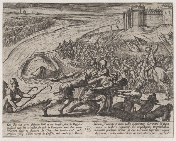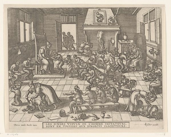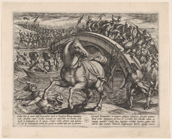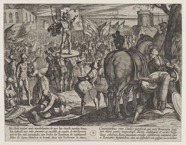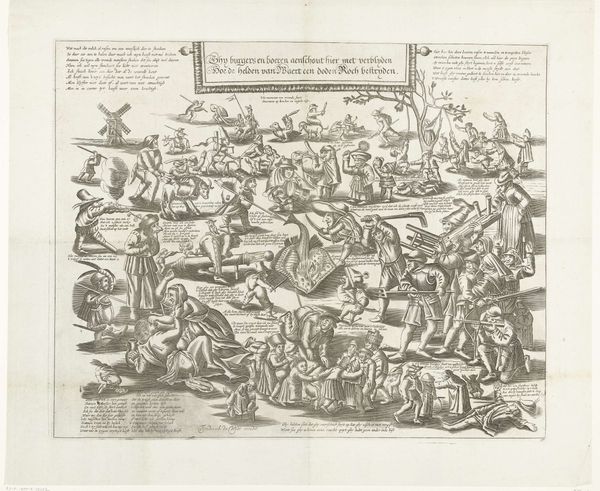 Curator: This intricate engraving, created between 1689 and 1706 by Carel Allard, is titled "De Hollandse Ridder op de Nederlandse Leeuw verjaagt het beest van Babylon, 1705". It’s currently held in the Rijksmuseum collection. Editor: What a flurry of figures and lines! My first impression is chaotic, yet undeniably dramatic. There's a strong contrast between the darker, crowded foreground and what seems like a more orderly procession in the background. Curator: Allard was a master printmaker. Here, the dense lines contribute to a highly detailed allegory, wouldn't you agree? Note the depiction of the Dutch Lion vanquishing the 'Beast of Babylon'—a clear reference to political and religious tensions of the period. Consider the social context: This print would have circulated widely, reinforcing nationalistic sentiments. Editor: The composition definitely reinforces that idea. The knight on the lion is the focal point, the lines all leading back to him. What is particularly compelling is the dynamism—how the artist managed to convey so much movement within the constraints of the engraved line. Semiotically speaking, each element, like the dragon or the crowd of figures in the foreground, functions as a signifier within the broader political narrative. Curator: Exactly. The technique also suggests a complex production process; Allard’s workshop surely had a role to play in dissemination. We can look at the print not only for its artistry, but also for what it tells us about the labor and industry of printmaking during the Dutch Golden Age. The paper, ink, the very act of reproduction - all are material manifestations of Dutch national identity being produced and consumed. Editor: From a purely formal perspective, I appreciate how Allard balances the dense areas with more open spaces to give the eye some breathing room. Even the inscriptions at the top and bottom, though visually separate, contribute to the overall structure. Curator: A very material form of visual rhetoric. Considering its time and place in history, this print functioned as both propaganda and commodity. Editor: Indeed. The piece uses sharp visual rhetoric. After further thought, my appreciation for Allard's control of line and composition grows, despite its initial appearance of chaos. Curator: Analyzing Allard’s piece this way emphasizes the potent impact this type of visual production would have had on its contemporary viewers.
