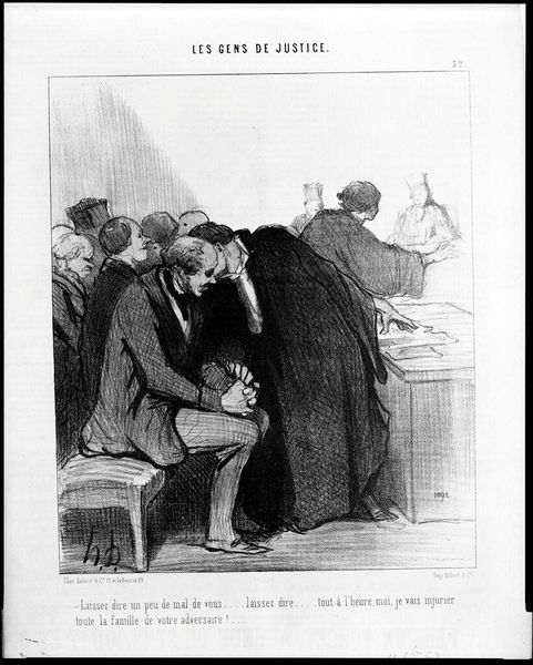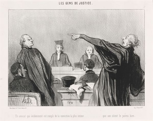 Editor: Here we have Honoré Daumier's "The Court, Settling the Deliberation…" It looks like a lithograph. The faces of the judges seem so severe. What statements might Daumier be making about power and justice here? Curator: It's a potent critique of the French legal system, particularly its class biases, wouldn't you agree? How does Daumier use caricature to highlight the perceived corruption or absurdity? Editor: The judges are certainly unflattering! I see how their exaggerated features and expressions convey a sense of injustice and perhaps even ridicule. Curator: Exactly. Consider also the historical context, a time of significant social and political upheaval. Daumier's work often served as a voice for the marginalized, challenging the status quo. Editor: So, this artwork is a form of social commentary, using art as a tool for activism and driving social change. Curator: Precisely. It reminds us that art can be a powerful tool for challenging injustice and advocating for equality.