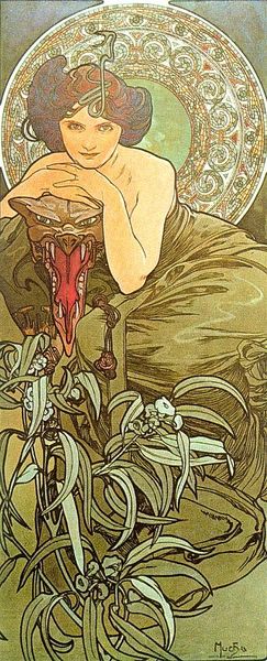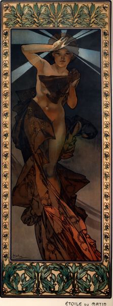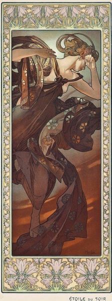 Alphonse Mucha's Etoile Du Soir, or Evening Star, is a lithograph, a type of print made using a flat stone or metal plate. Mucha was a master of this reproductive technique, which allowed for the mass production of images. The sinuous lines and stylized floral motifs are hallmarks of the Art Nouveau style, and reflect a desire to embrace industrial methods while still creating beautiful objects. The process begins with an artist drawing on a prepared surface, which is then treated with chemicals to create areas that will attract or repel ink. Paper is pressed against the surface, transferring the image. The result is a relatively inexpensive artwork, available to a wider audience than a painting or sculpture. Mucha skillfully blurred the line between fine art and commercial design, creating images that were both aesthetically pleasing and easily reproducible. By embracing the possibilities of lithography, Mucha made art accessible in a time of rapid industrial and social change. This reminds us of the skill in many forms of making, and the rich contexts they arise from.