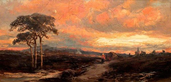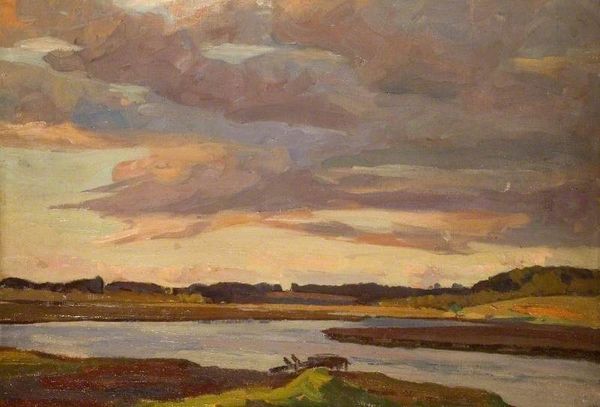 Editor: So, this is Algernon Talmage’s “Before the Storm, Tintagel, Cornwall,” painted in 1922. Looking at it, I’m struck by the… the sheer drama of the sky. It feels like a really weighty atmosphere pressing down on the landscape. What do you see in this piece? Curator: What I see is a visual encapsulation of early 20th-century Britain grappling with its past and future. Talmage, working in 1922, after the devastation of World War I, presents us with Tintagel, steeped in Arthurian legend, under a sky heavy with implied threat. The choice of subject, a site loaded with romantic national mythology, juxtaposed with that turbulent sky, feels incredibly deliberate. How do you think the socio-political climate might have impacted the artist's choice of subject and its portrayal? Editor: I guess… people would have been searching for stability, maybe looking to the past for reassurance while also being uncertain about what was ahead. Maybe Tintagel represented that longing for a romanticized, stable past? Curator: Precisely. The composition itself plays into this tension. Notice how the landscape is almost secondary, dominated by the overwhelming sky. It suggests a powerlessness, perhaps mirroring the nation's feelings after the war. And how does the somewhat muted color palette affect your interpretation? Editor: It makes the painting feel almost melancholic, like the weight of history and the impending storm are pressing down. I hadn’t really considered the social context that much. I was focused on the atmosphere itself, but thinking about it as a reflection of Britain's state of mind… that adds so much more depth. Curator: Exactly. It moves beyond a simple landscape to a powerful commentary on national identity and collective anxiety. This work isn’t just pretty scenery; it’s a reflection of the nation's psyche in a moment of profound transition. Editor: I will never look at another landscape the same way. Thanks. Curator: And I hope this reminds us that art is in dialogue with history, not isolated from it.