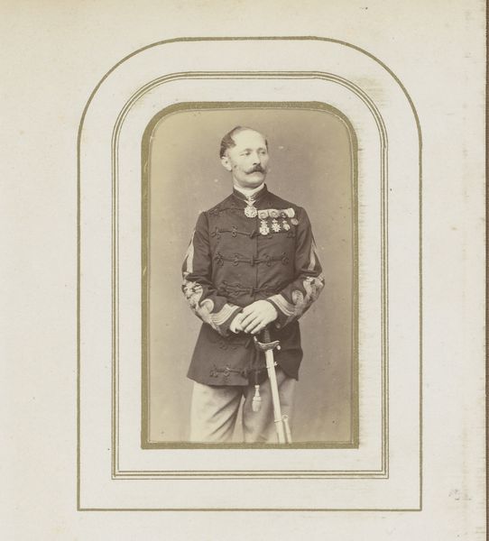 Editor: This portrait, "Portret van een man met zwaard en sigaar in uniform met medailles," was created around 1862 or 1863 by Maes & Michaux, using a daguerreotype. There's something quite striking about the subject's gaze and the overall formality. What do you make of this piece? Curator: This photograph is thick with symbolism. We see a man adorned with the regalia of military rank – the uniform, the medals, the sword, even the cigar held with a certain nonchalance. These aren’t merely decorative; they're deliberate visual cues intended to project power, authority, and a specific social standing. Ask yourself: what does a sword represent, culturally and psychologically? Is it just about violence, or also about justice, protection, honor? Editor: So the sword and the uniform aren't just about identifying him, but actively constructing an image? Curator: Precisely. Photography in this era was a relatively new technology. How do you think people approached having their portrait taken? Was it merely to record likeness, or to cement an image for posterity? Notice how he presents himself—there’s a deliberate theatricality at play, carefully constructing his self-image through these very potent symbols. He is trying to leave something behind. Editor: I never thought of portraiture, especially early photography, as being so intentional in its symbolism. It really changes how you view these images. Curator: Indeed. The trappings of status tell only half the story. The slightly weary eyes, the subtly defiant set of his jaw—they hint at a much richer inner life, a potential conflict between public image and private self. It’s a tension that elevates this photograph beyond a simple record. Editor: It is quite intriguing. Now I’m left wondering what his story truly was. Thanks for your insight!
