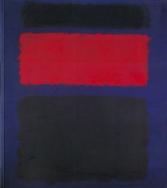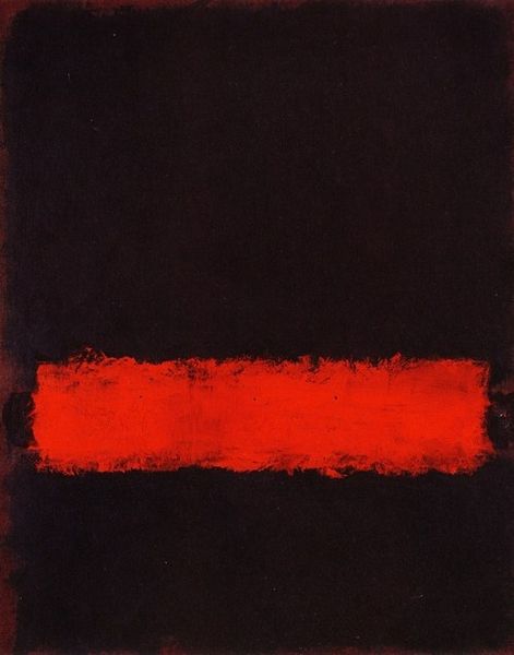 Curator: Mark Rothko’s "No. 20" from 1957, now residing at the National Gallery of Australia, presents us with a fascinating exploration of color and form through oil paint on canvas. Editor: It’s immediately arresting, isn’t it? The somber, almost brooding rectangles floating in that sea of reddish hues... it evokes a deep sense of introspection for me. Curator: The application of thin layers, almost glazes, allows light to permeate the pigment, a characteristic technique of Color Field painting, the art movement where Rothko played a huge role. It is his use of material that draws me. How the build up changes its hue in a room. Editor: Absolutely. And the arrangement, the interplay between these dark, seemingly weighty rectangles and the fiery background…it’s loaded with symbolic weight. Do the colors represent an inner state, a cultural memory perhaps? The orange has the symbolic weight of courage. Curator: I understand that the symbolic implications can be interesting, but the real power, for me, lies in the materials. Look closely at the edges—the blurry, imprecise application challenges traditional painting and instead highlights materiality of paint and the gestures of application. Editor: Yes, but consider that those blurred edges are also emotionally charged boundaries. Are we not looking at Rothko contemplating the boundaries of the Self through the haze of existence? Each area as distinct, together they create an atmosphere of quiet contemplation that carries considerable emotion. Curator: Possibly, but you can get to the essence through materials and the process of the painting alone. Editor: So you don't think that this piece would be so popular, without the symbology embedded within? Curator: To answer your question directly, no, I don't believe symbology matters as much in this type of painting. Editor: I still think the appeal transcends the materiality and exists because it reflects back the audience in ways material alone does not. Curator: An interesting thought to consider, I will mull it over.