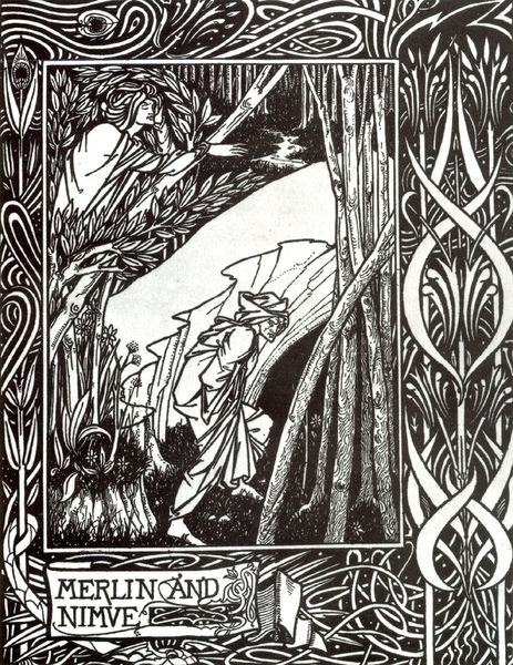 Editor: Here we have Otto Eckmann's "Schwertlilien" from 1895, a print employing woodcut techniques. The strong contrast between the black and subtle yellow areas immediately grabs your attention, creating a somewhat dramatic, stylized image of irises. How do you read the composition of this piece? Curator: The power of this woodcut resides in its formal qualities: observe the sinuous lines that define the organic forms, typical of Art Nouveau. Eckmann simplifies the natural world, emphasizing the rhythmic interplay of positive and negative space. Consider how the dense black areas juxtapose against the delicately carved linear details of the leaves, and where there's yellow. What effect does that color choice produce? Editor: It seems to add a touch of elegance and lightness to a design dominated by darker, heavier areas. How would you unpack the significance of this almost surreal interplay between natural form and graphic pattern? Curator: Note the deliberate flattening of perspective; the composition favors a two-dimensional plane. It isn't about representing reality. It seems Eckmann is investigating the essence of the iris. Line becomes both descriptive and ornamental. Is he perhaps questioning our expectations of botanical art? Editor: Yes, it certainly disrupts traditional botanical illustration, inviting a new, stylized way of seeing nature. It seems almost like a study in shapes, values, and mark-making above all else. Curator: Precisely. Its value rests not on verisimilitude but on its innovative treatment of form, line and surface. It reminds us to value the abstract qualities of art itself. Editor: That emphasis on the formal elements is something I will certainly be considering when viewing more works. Curator: As will I.