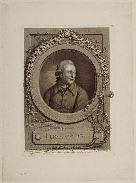 Editor: This is Johann Friedrich Bause’s 1787 engraving of Georg Forster. It's fascinating how detailed and refined the lines are. What symbols and cultural references stand out to you in this piece? Curator: The circular frame adorned with ivy immediately catches my eye. The circular format inherently symbolizes completeness, eternity, and the cyclical nature of time. Considering the historical context of the Enlightenment, which fostered exploration and scientific inquiry, ivy, a symbol of attachment, memory, and immortality, implies Forster's lasting contribution to knowledge. What emotional effect do you think that has on the viewer? Editor: That's a good question. I guess the artist and patron wanted to portray Forster as intellectual and everlasting? Curator: Precisely. Think about the gaze too. Forster isn't looking directly at us, but rather off to the side, almost as if contemplating something. That communicates intellectual depth and invites us, as viewers, to ponder what occupies his thoughts. And the lettering is in Latin. Why do you think that is? Editor: Perhaps Latin suggested the historical grandeur of the Roman Republic, or just universalism, given the Enlightenment ideals? Curator: Exactly! Neoclassicism very intentionally looked back. These choices create a sense of continuity with the past and anchor him within the intellectual tradition of Europe. Editor: This makes me rethink how portraiture can actively shape historical memory through strategic symbols. Thanks so much for sharing. Curator: My pleasure. Every symbol whispers a cultural story!