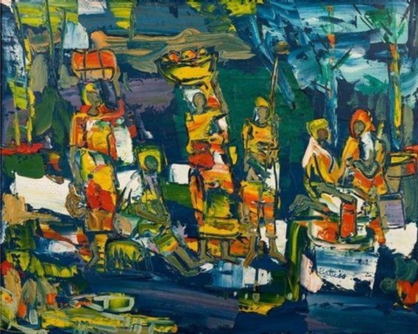 Curator: Immediately striking is the canvas's energetic rhythm, achieved through a dynamic interplay of line and vibrant color. Editor: This is Walter Battiss’s "African Figures", painted around 1950 using acrylics on canvas. Battiss was deeply interested in indigenous cultures, and that's reflected here. It evokes a sense of communal activity. Curator: Note the planar construction. Figures and flora meld, creating a flattening of space characteristic of Fauvist strategies. How do you perceive the treatment of form? The boundaries almost dissolving... Editor: The work reflects post-war South Africa and, I think, escapism. There was burgeoning awareness internationally about the continent coupled with oppressive domestic policies, this picture almost creates an idealized, flattened vision of the homeland, with those rhythmic brushstrokes speaking of vitality and life. Curator: The color relationships underscore that ideal. The high-keyed turquoise background emphasizes the oranges and yellows of the flora, juxtaposed with those muted figure forms to really set up an intricate surface tension and reinforce the spatial ambiguities. Editor: It's important to consider how Battiss positioned himself within South African art during that period. He wanted to champion a more inclusive artistic representation and a kind of romantic vision of native life in opposition to oppressive, deterministic perspectives. Curator: Yes, considering this, those flat planes read like both decoration and also depth, that shallow space. In regard to the structural aspect, how well the shapes of the figures resonate with the placement of the painted foliage is stunning, everything sits just so, nothing jars. Editor: And though it reflects certain trends and concerns, I believe there’s also genuine fascination, a respect present for the subjects, even as he is adopting these flattening techniques from European modernism. I admire Battiss for engaging on this path in such divisive times. Curator: Thinking through his arrangement of form, color and stroke, there is undeniable aesthetic value independent of what his personal and cultural values are; that makes the image quite enduring. Editor: Precisely. A stimulating dialogue between abstraction and figuration, and a reflection of complex realities. Thank you for joining me on this exploration.