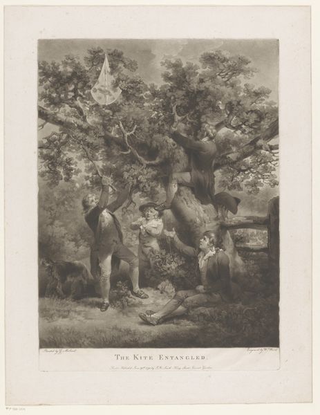 Etienne Leguay created this print, "Two Lovers in a Cherry Tree," and it offers us a glimpse into the romanticized ideals of pastoral life. During this era, there was a fascination with portraying love and nature, often intertwined. Here, the artist presents a couple sharing cherries, a symbol of love and fertility, set against a lush, idealized landscape. The man is standing on a ladder, picking the cherries and feeding the woman who sits below him. It speaks to themes of courtship and the gentle pursuit of affection, characteristic of the period’s artistic sensibilities. However, this image also hints at the social constructs of gender roles, where men take on the active role of provider and women are depicted as passive recipients. The print invites us to reflect on the emotional nuances of love and longing and the historical context that shaped its representation.