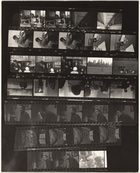 Robert Frank made this contact sheet, "Family--New York City no number," with photographic materials. The array of images, organized in strips, give us a peek into the artist's process. It’s like looking at a painter's palette—you can see where he was headed, the possibilities considered. I love how the textures play out here. The grain of the film is so present, like the weave of a canvas. Notice the contrast between the sharp focus in some frames and the blur in others, creating a rhythm across the sheet. The dark, dense areas make the lighter parts feel almost luminous. Look closely at the frame in the middle; it looks almost totally blown out. It reminds me a bit of Gerhard Richter's photo paintings, where the blur and imperfections become the point. Both artists embrace chance and imperfection. It makes you realize art isn't about perfection but about capturing a moment, an idea, a feeling—messiness and all.