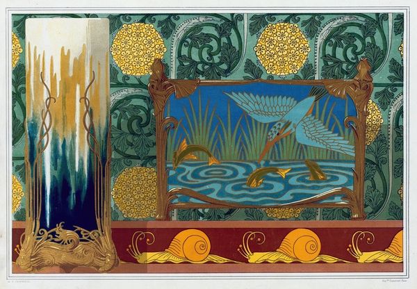 Oiseaux, jeu de fond. Escargots et champignon. Coccinelles et capillaires, étoffe. Faisan dorés et iris, bordure. 1897