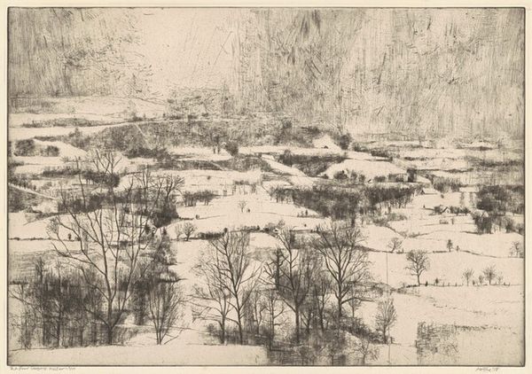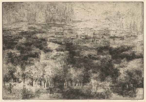 Editor: Here we have Moishe Smith’s "View of Portofino," an etching from 1963. The density of lines is striking, creating a really interesting texture, almost like a pencil drawing. How do you interpret the overall composition and visual impact? Curator: Note the considered arrangement of visual elements. The dense, almost impenetrable thicket of trees in the foreground frames a distant cityscape. Smith's conscious manipulation of tonal values, particularly the contrasts between light and shadow, are evocative. Observe how these darker, heavily etched areas in the lower portion push the ethereal sky and more delicate lines in the upper reaches, drawing our eye toward them. The structural rigor underpinning this apparent spontaneity creates a satisfying visual tension, wouldn't you agree? Editor: Definitely. It almost feels like there's a push and pull between the solid trees and the hazy background. It isn't a conventional picturesque view at all, is it? Curator: Precisely! He eschews traditional notions of picturesque beauty, favouring instead a focus on the structural components of the landscape. He extracts, almost distills, the subject’s geometric essence. The dense network of marks that composes the lower trees resolves into a clearly organized depiction when you attend to his tonal architecture. Editor: So you’re saying he prioritizes the formal qualities over a purely representational depiction? Curator: Precisely! The power of the artwork resides in the relationships of shape, tone, and line – and it is through these careful interplays that meaning arises. We are looking *at* the scene, but more pointedly, *into* the artistic choices. Editor: This perspective really helps me appreciate how the artist makes his choices! Curator: Indeed! It allows us a greater appreciation for his overall skill and design!