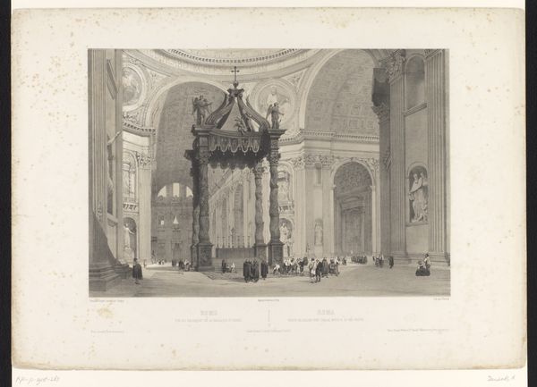Curator: Standing before us is an etching from somewhere between 1845 and 1847 titled "Interieur van de kerk La Madeleine" by Charles-Claude Bachelier, capturing the interior of the famous Parisian church. Editor: It’s quite striking, this depiction. The symmetry almost overwhelms the human figures within, giving a sense of insignificance against the backdrop of architectural grandeur. Curator: Indeed. Let’s consider the material and its production. This isn't a spontaneous sketch, but an etching, meticulously crafted and printed. Etchings such as this were frequently created and circulated as historical records of public landmarks. Its means of production highlights a wider story about nineteenth-century practices of visualizing and consuming landmarks through mass reproducible prints. Editor: I’m more drawn to the visual language at play. Notice the use of line to define volume and space. The architectural rendering is highly detailed, bordering on photorealism, and evokes both mass and weight. The receding lines draw the eye to an indefinite point. It’s all about creating a believable, albeit idealized, three-dimensional space on a flat plane. Curator: The church itself is very telling. The Madeleine's neo-classical style speaks volumes about the social and political climate of the time. It had been used as a church, then a temple of glory by Napoleon, and finally reinstated as a church. So, the building material signifies complex intersections of religious, political and imperial aspirations. Editor: From a purely visual perspective, there is also a symbolic play with light and dark to add a dimension of depth and spirituality to the artwork. The figures are also framed using light in their environment. Curator: It is hard not to be awestruck by how it has been conceived, manufactured, consumed and circulated in its time, and consider its broader historical narrative. Editor: I see now, but as much as the broader implications are of interest, the pure artistic virtuosity of this piece really stands out for me, leaving a lasting impression through its sheer visual impact.