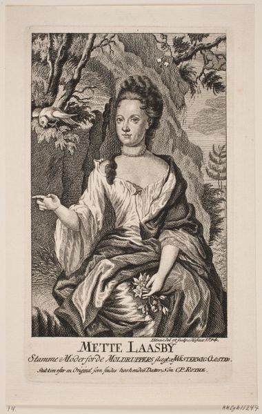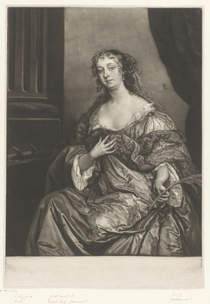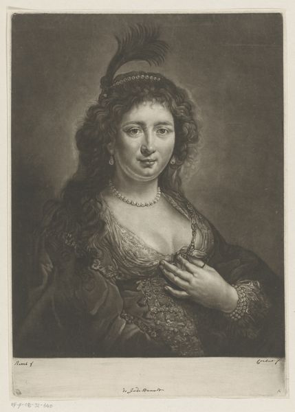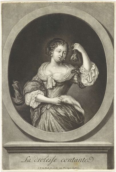 Editor: So, this is "Portret van een onbekende vrouw als Flora," created around 1660 by Jan van Troyen. It's an engraving. There’s something almost melancholic about her gaze… what do you see when you look at it? Curator: I see layers of meaning embedded in this seemingly simple portrait. The title identifies the sitter as Flora, the Roman goddess of springtime and flowers, suggesting themes of renewal and beauty. But even without blooming accessories, this representation taps into deeper cultural associations. The woman embodies an ideal, becoming a vessel for springtime. Editor: A vessel… that’s interesting. How does her depiction convey that specifically? Curator: Notice the softness of her features, the gentle curve of her hand. The way she holds what appears to be some kind of writing tool – a stylus, perhaps? Think about Flora’s domain, and how often the ephemeral beauty of flowers is captured through art, through words. She becomes both the embodiment of spring and the artistic muse. Editor: So the stylus symbolizes creation and artistic inspiration connected to the natural world? Is that a common visual reference? Curator: Indeed. The stylus, in this context, connects her to the act of creation. How do you interpret the background, the slightly obscured drapery? Editor: It creates a sense of enclosure. Like she’s captured in this moment, preserved as Flora forever. It’s thought-provoking how a portrait can hold so many symbolic layers. Curator: Exactly. Every detail, consciously or unconsciously, contributes to the visual narrative. It invites us to consider how we continuously reimagine archetypes within our own cultural framework.