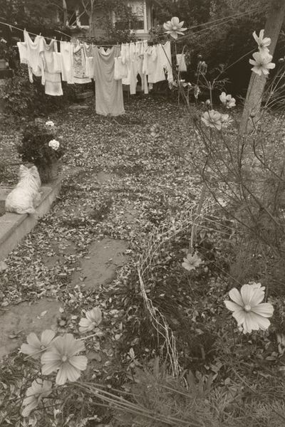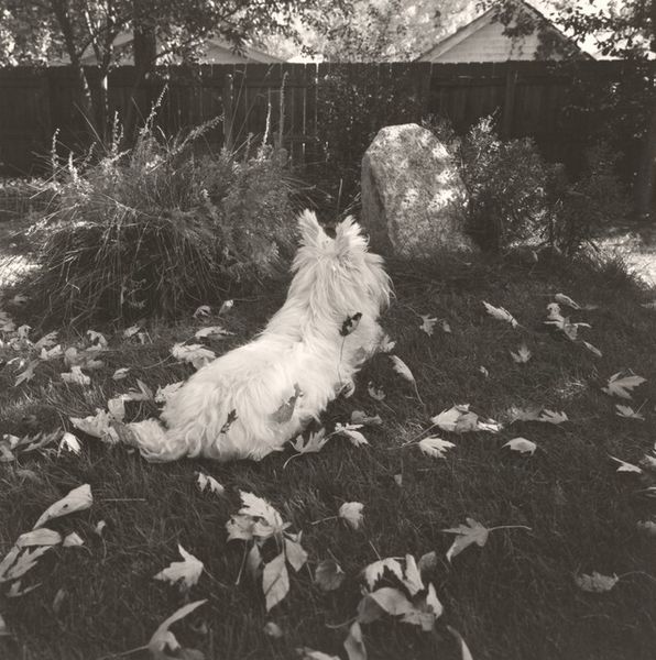 Curator: What strikes me first about this photograph is the light, filtering so beautifully even through the dense foliage, creating almost dreamlike gradations. Editor: Absolutely, there’s a distinct atmosphere there, a certain softness to it all. We are looking at "Longmont, Colorado, Sally in the Backyard," a gelatin-silver print captured sometime between 1982 and 1992 by Robert Adams. Adams, of course, is so well-known for chronicling the changing landscape of the American West. Curator: "Sally in the Backyard," what a title. I imagine it's Sally, the shaggy dog towards the back of the picture, gazing pensively into the depths of the frame. Is it my imagination or is the garden sort of an "allegory" of human life itself, perhaps? Look, at first glance it all looks very wild, and a bit gloomy—yet it feels nurtured, protected somehow by that strange wire fence or decorative screen… almost tender, wouldn’t you say? Editor: Yes, tender is one word, another could be fraught. That image of supposed domesticity and care that you see… I can’t help but wonder, who is it really “for?" The work comes from a pivotal period when Adams was deeply invested in ecological themes and how the expansion of suburbia intersected with both personal histories and the larger environmental narrative. That delicate metal border –is it safeguarding life or confining it? Adams consistently questioned the narratives of progress and beauty. Curator: Mmm. Good point. So even beauty itself is brought under suspicion? I am wondering, perhaps this very act of trying to define "beauty" can imprison it. Can any real kind of "progress" actually exist? Maybe progress and beauty are just another kind of artifice… Perhaps, like that fence. Maybe wildness is all we've actually got. Editor: Well, if Adams' images teach us anything, it’s to look closely at the everyday— at those spaces where nature and humanity negotiate— to confront difficult questions about how we choose to live. There are always paradoxes. The work resists easy answers. Curator: Maybe that’s its ultimate charm. Editor: And perhaps its deepest provocation.
