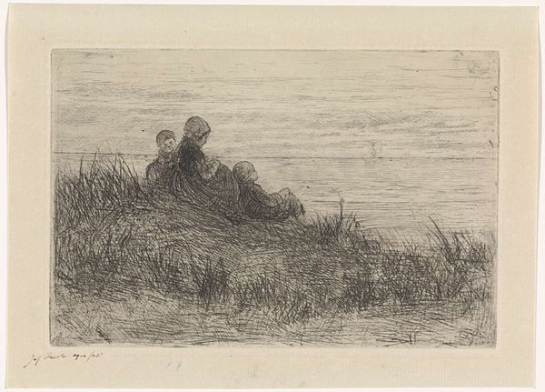 Editor: Here we have "A premiere" created by Anders Zorn in 1890, an etching in black and white of a mother and child wading into water. The hatching gives it a sense of movement and it looks like the start of a swim. What stands out to you about this piece? Curator: The etching process itself is key. Zorn's labor intensive technique--scratching into the metal plate to create these myriad lines-- speaks volumes about his artistic choices. He didn't choose painting, a technique valued at the time by high society. Why engage with reproductive technologies like etching and its potential for mass distribution of imagery, with an almost democratic intention, when he was, indeed, known for his society portraits? Editor: That’s fascinating! So you’re saying that choosing etching had some kind of social meaning back then? Curator: Exactly. The accessibility of prints versus unique paintings made it inherently a more democratic medium. What kind of patronage was Zorn aiming for? Was he commenting on the role of mothers, making it more accessible to them? Was he marketing towards women, as photography began to emerge as a competitor for painted portraiture commissions from this gender? Editor: I hadn’t considered how the materials and methods themselves could make a statement. I just saw it as an image! Curator: Think about the material conditions. What tools would Zorn use, what workshop, what kind of inks, who was able to access prints? What sort of exchange would have taken place in his studio, or through print vendors? Understanding the economic factors involved, and thinking about his consumers, makes you rethink Zorn’s motivations. Editor: So, it’s about the whole ecosystem of artmaking, not just the image itself. I’ll definitely keep that in mind! Thank you.