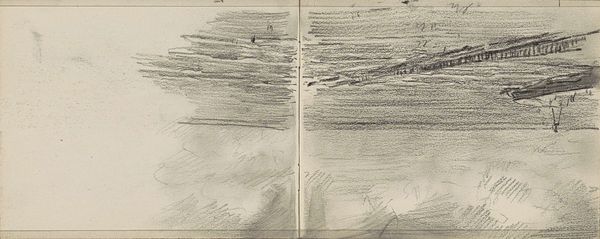 Curator: This is Willem Witsen’s "Rivierlandschap," or "River Landscape," likely created between 1906 and 1909. It’s a drawing executed with pencil and pen on toned paper. Editor: There's a compelling, almost oppressive atmosphere. The darkness pressing down from above makes me think of environmental degradation and human encroachment on nature, issues relevant even then, don’t you think? Curator: Absolutely. The rapid industrialization of the Netherlands at the time undoubtedly cast a shadow—literal and figurative—over the natural world, reflected here. Consider the Symbolist movement that permeated the Netherlands back then; these kinds of motifs can't be separated from sociopolitical concerns, urbanization, poverty, the plight of the working classes. Editor: You’re right. It feels very of the time, especially because of that stark dark blotch. It dominates the scene. What do you make of it? It could be a large tree but, with my understanding, the ink blob itself suggests something ominous—perhaps society obscuring a vital view? Curator: It might even signify the rise of the 'black ships', symbolic of industrial transport and perhaps also echoing images from Dutch naval history and colonial exploitation. This artwork as resistance. Editor: Fascinating to see so much encoded in what at first seems like a simple river drawing. There are hand-drawn lines visible from its sketchbook binding, grounding it as part of a tangible process, as an expression and observation combined. It lends intimacy to what could have been a starker message. Curator: Precisely. We should remember that artistic expressions never exist in a vacuum. Considering societal developments allows a deeper appreciation for the layers of meaning contained within it. Editor: It’s really rewarding to look beyond just what is represented. I will be walking away seeing symbols of concern within such simplicity. Curator: The layered historical meanings woven into this simple image invite us to reconsider what we may take for granted, not just about art, but about our connection with nature, and about society as a whole.