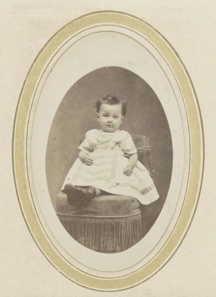 Curator: The subtle tonality gives a wistful impression in this albumen print, "Portret van een onbekend kind," attributed to Petz & Co., likely taken between 1871 and 1890. Editor: Wistful is the right word. It’s the solemn expression, coupled with the formal setting, which conveys a rather somber tone for such a young child. You wonder what pressures that infant was facing in such an era. Curator: The photographic portrait, particularly of children, evolved into a ritual during this period, didn’t it? Almost a symbolic claim on life, given infant mortality rates. Editor: Precisely! And consider who could afford such portraits. The socio-economic implications are profound. We see the chair as an emblem of status and the child dressed for display, almost a miniature adult. Curator: And let’s consider the necklace, perhaps a protective amulet or a familial token, hinting at lineage and belonging. Its circular form may symbolize eternity. Editor: True. However, might it also be a sign of subjugation? Even in the seemingly innocuous detail of jewelry, power dynamics can surface. The child isn’t naturally adorned, is placed into an image of status by familial expectations. Curator: Interesting to consider. I perceive this not as a mark of domination but the preservation of identity. Images create continuity. Each picture narrates an unspoken chronicle of who we are and what came before. It serves as a psychological anchor. Editor: Fair point. Regardless, these photographs open a dialogue, provoking questions on race, power and legacy, through what appear to be simple aesthetic choices. Curator: Absolutely. A reminder of our connected past, seen through these fleeting visual signifiers. Editor: Definitely! And understanding those silent symbols encourages meaningful critical dialogue about the present, which gives the portrait a future relevance.
